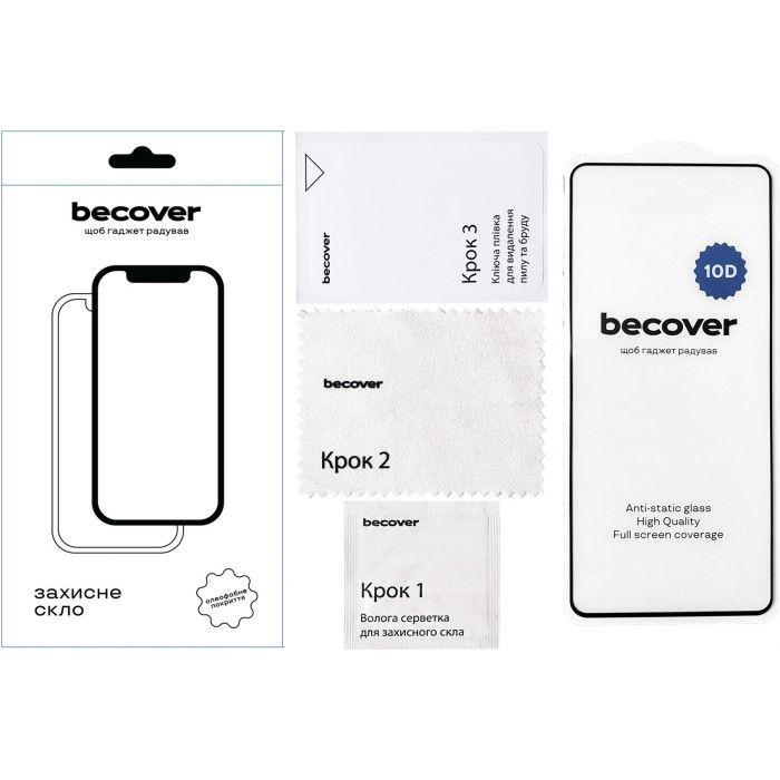 Повне покриття: Скло 10D має закруглені краї, що дозволяє йому ідеально прилягати до екрану смартфона, забезпечуючи повний захист без проміжків.