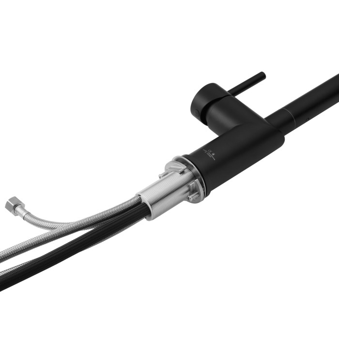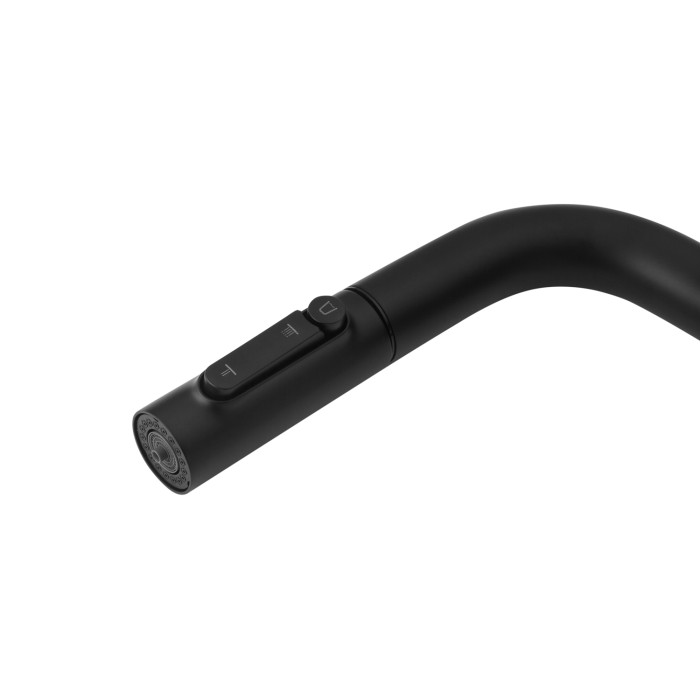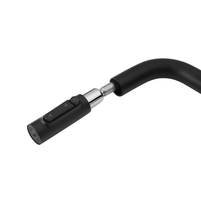 Модель оснащена висувним шлангом, що значно спрощує миття посуду, наповнення місткостей і догляд за мийкою. Особливістю змішувача є зручне управління подачею питної води — кнопка перемикання розташована прямо на самій висувній лійці, що робить використання максимально інтуїтивним і комфортним без зайвих рухів.