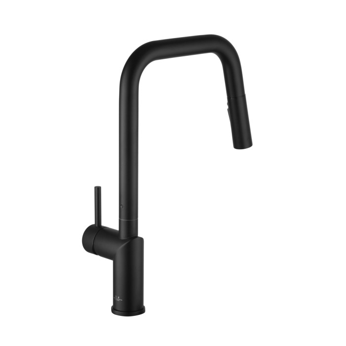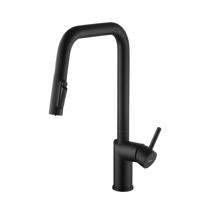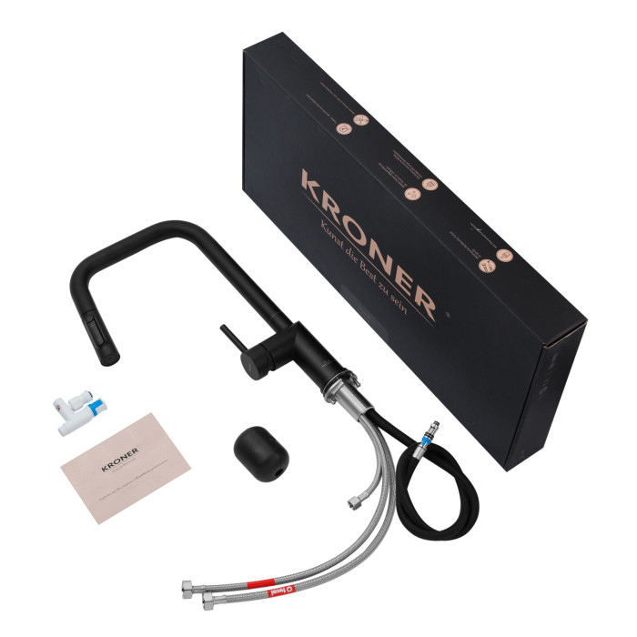 Змішувач для кухні Kroner Element 296569B-3801 — сучасний і технологічний кухонний змішувач у стильному чорному кольорі з матовим покриттям, який ефектно підкреслює інтер'єр і виглядає особливо актуально в кухнях у стилі лофт, модерн або мінімалізм.