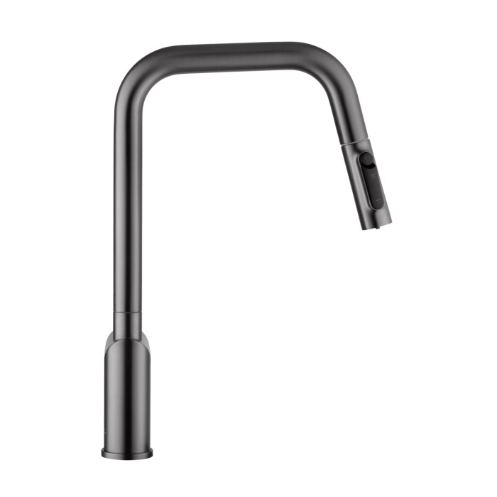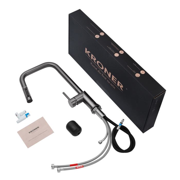 Змішувач для кухні Kroner Element 296569B-5301 — сучасний і технологічний кухонний змішувач у стильному графітовому кольорі з матовим покриттям, який ефектно підкреслює інтер'єр і виглядає особливо актуально в кухнях у стилі лофт, модерн або мінімалізм.