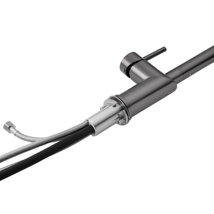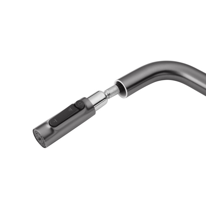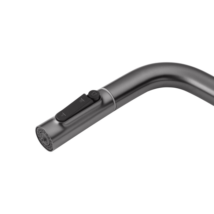 Модель оснащена висувним шлангом, що значно спрощує миття посуду, наповнення місткостей і догляд за мийкою. Особливістю змішувача є зручне управління подачею питної води — кнопка перемикання розташована прямо на самій висувній лійці, що робить використання максимально інтуїтивним і комфортним без зайвих рухів.