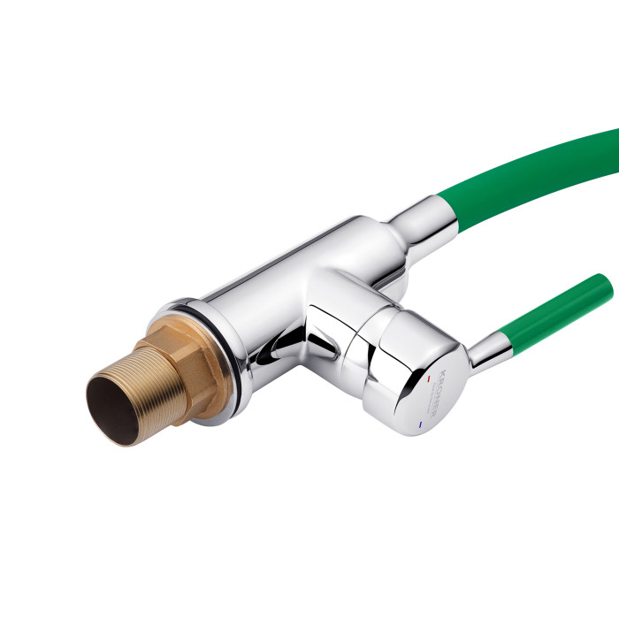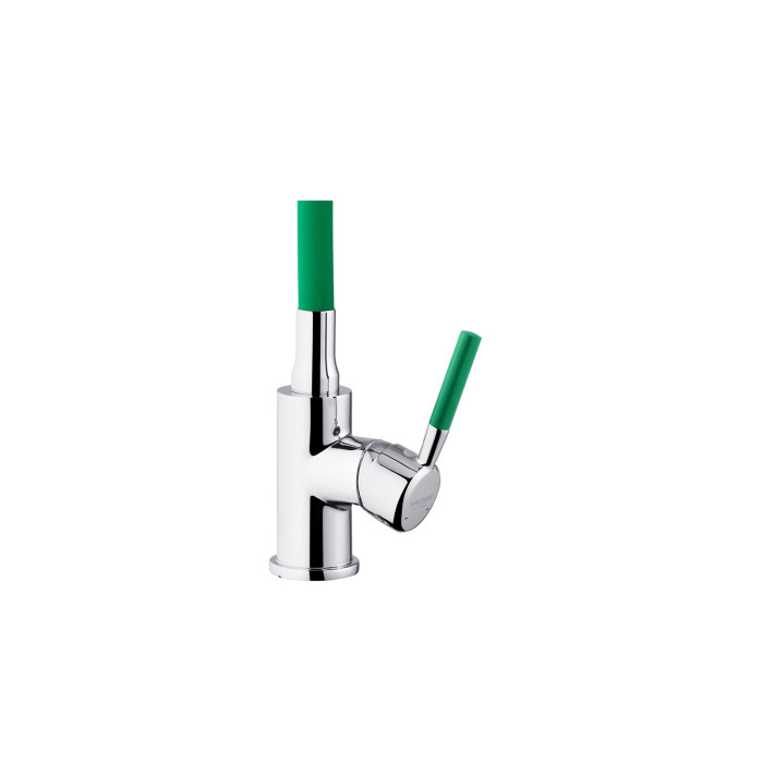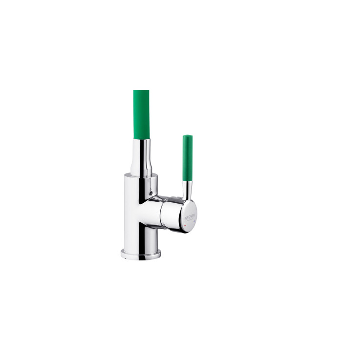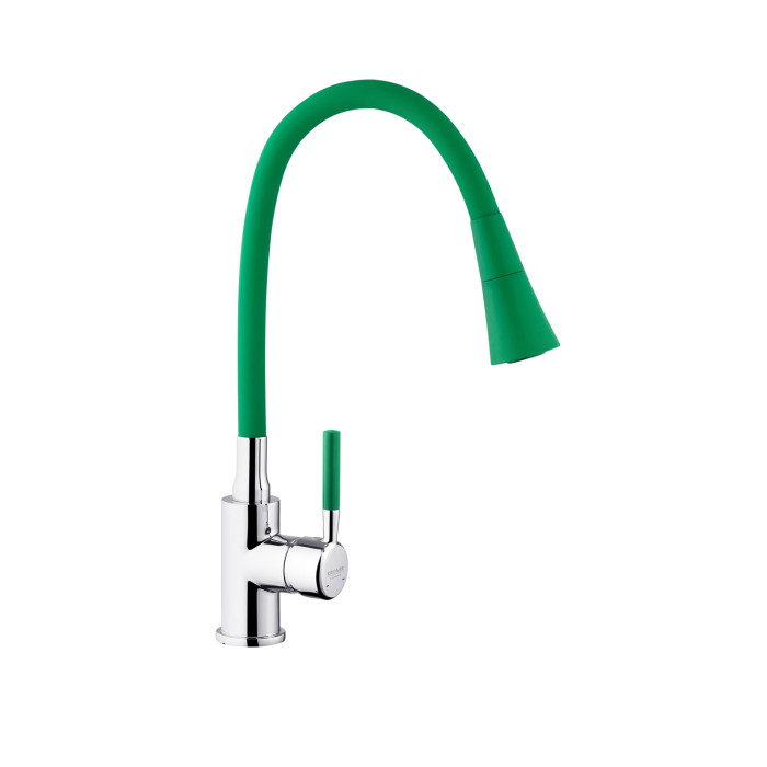 Змішувач має врізний тип монтажу з кріпленням за допомогою гайки, що забезпечує надійність фіксації. Гнучкий тип підведення дозволяє зручно під'єднати змішувач до водопроводу. Корпус виконаний у хромованому кольорі, а вилив у зеленому, що надає йому елегантного вигляду. Поверхня корпусу глянсова, а вилив має матове покриття.