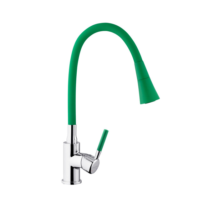 Змішувач для кухні Kroner KRM Kuche - C132GRN - це стильний та функціональний варіант для вашої кухні. Виготовлений з високоякісного силуміну з силіконовим виливом, він поєднує міцність і зручність в експлуатації. Одноважільне керування дозволяє легко регулювати температуру і потік води.