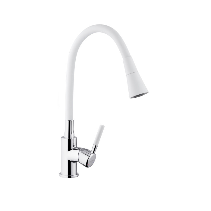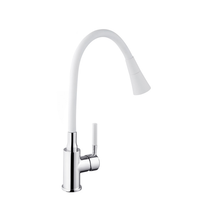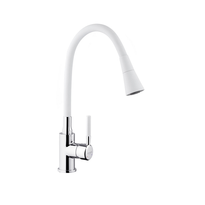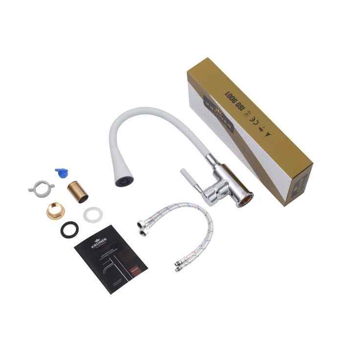 Змішувач для кухні Kroner KRM Kuche - C132WHI - це стильний та функціональний варіант для вашої кухні. Виготовлений з високоякісного силуміну з силіконовим виливом, він поєднує міцність і зручність в експлуатації. Одноважільне керування дозволяє легко регулювати температуру і потік води.