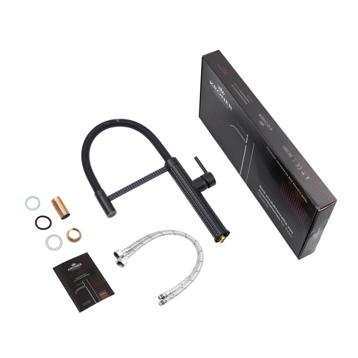 Змішувач для кухні Kroner KRP Ersel - SCH03999 поєднує в собі елегантний матовий корпус чорного кольору з функціональним чорним рефлекторним виливом, що робить його ідеальним вибором для будь-якої сучасної кухні.