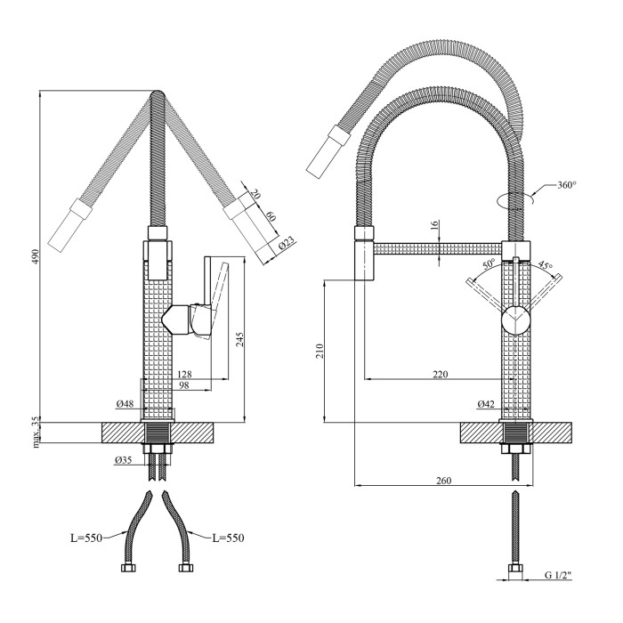 Монтаж змішувача здійснюється врізним способом, що надає кухонній мийці стильний і сучасний вигляд. У комплект входять шланги для підключення діаметром 1/2'', що значно полегшує процес встановлення.