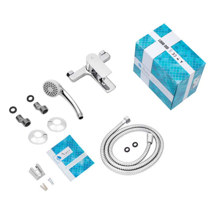 Змішувач, лійка для ручного душу, душовий шланг, кронштейн для ручного душу, кріплення, інструкція.