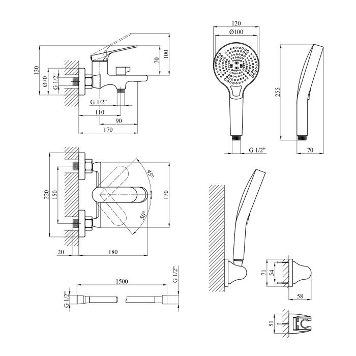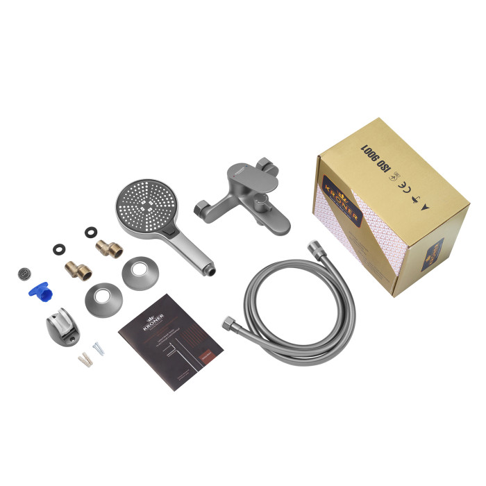 Змішувач, лійка для ручного душу, душовий шланг, кронштейн для ручного душу, кріплення, додатковий аератор, ключ для аератора, інструкція.
