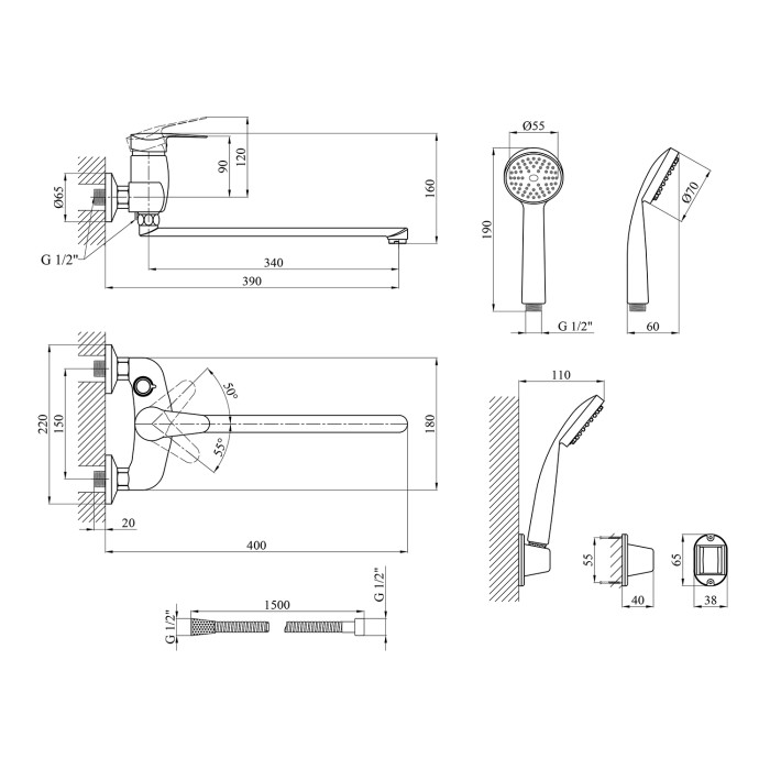 Змішувач, лійка для ручного душу, душовий шланг, кронштейн для ручного душу, кріплення, інструкція.