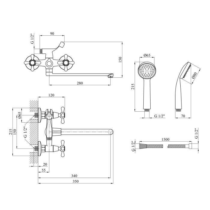 Змішувач, лійка для ручного душу, душовий шланг, кронштейн для ручного душу, кріплення, інструкція.