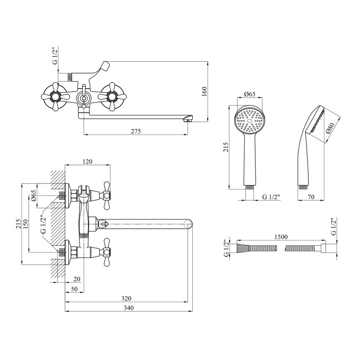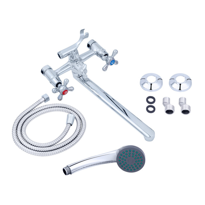 Змішувач, лійка для ручного душу, душовий шланг, кронштейн для ручного душу, кріплення, інструкція.