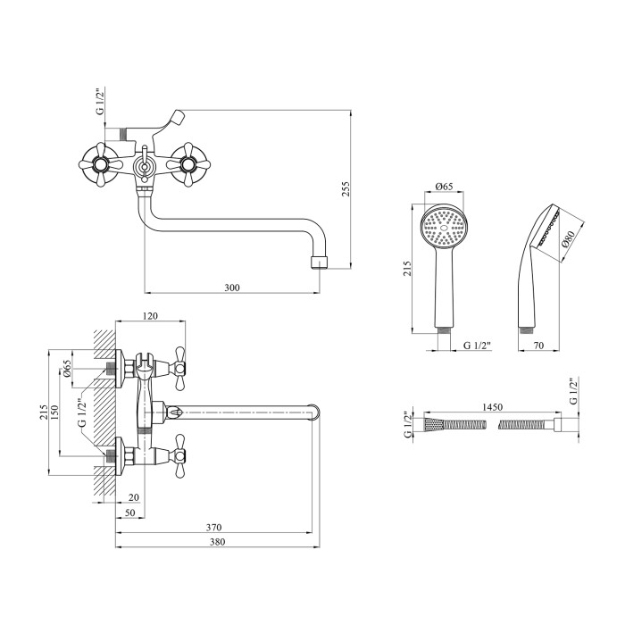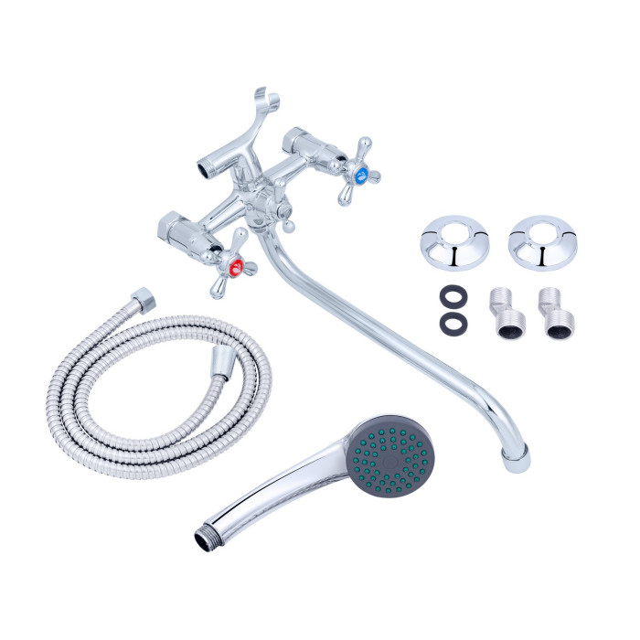 Змішувач, лійка для ручного душу, душовий шланг, кронштейн для ручного душу, кріплення, інструкція.