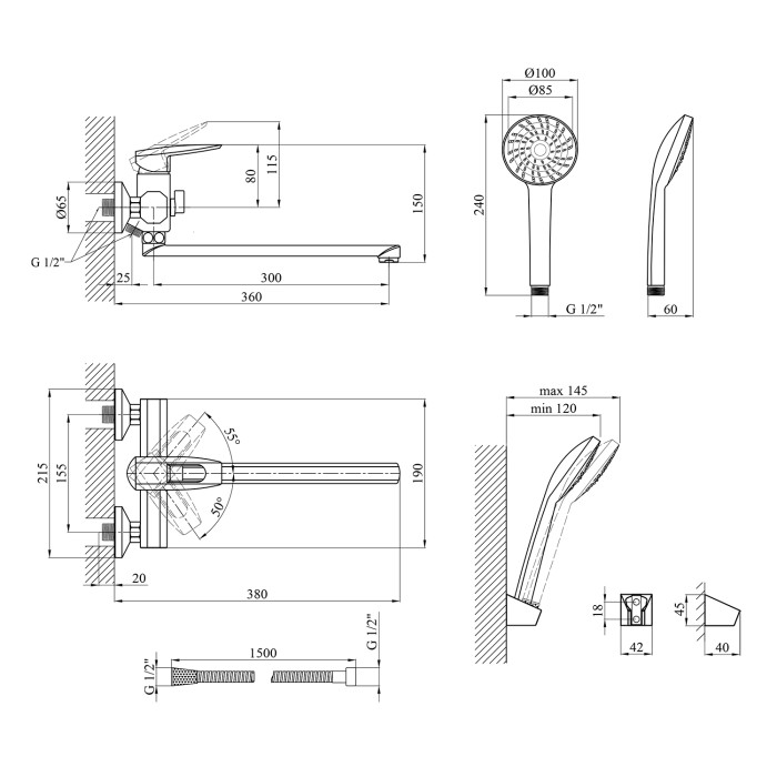 Змішувач, лійка для ручного душу, душовий шланг, кронштейн для ручного душу, кріплення, інструкція.