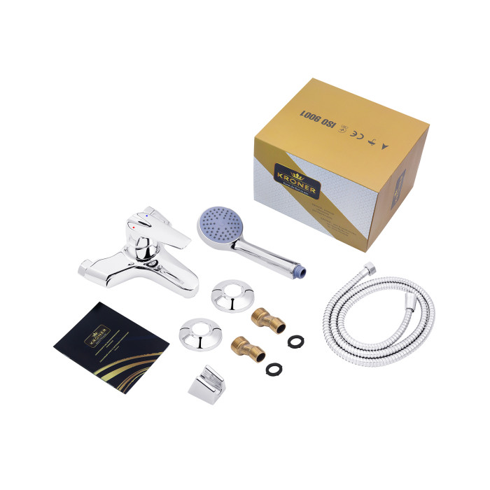 Змішувач, лійка для ручного душу, душовий шланг, кронштейн для ручного душу, кріплення, інструкція.