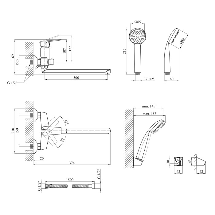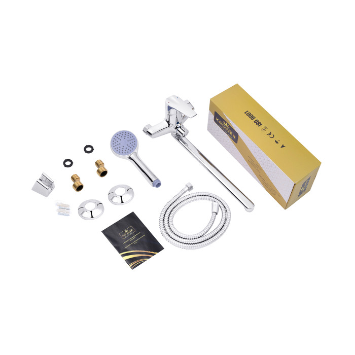 Змішувач, лійка для ручного душу, душовий шланг, кронштейн для ручного душу, кріплення, інструкція.