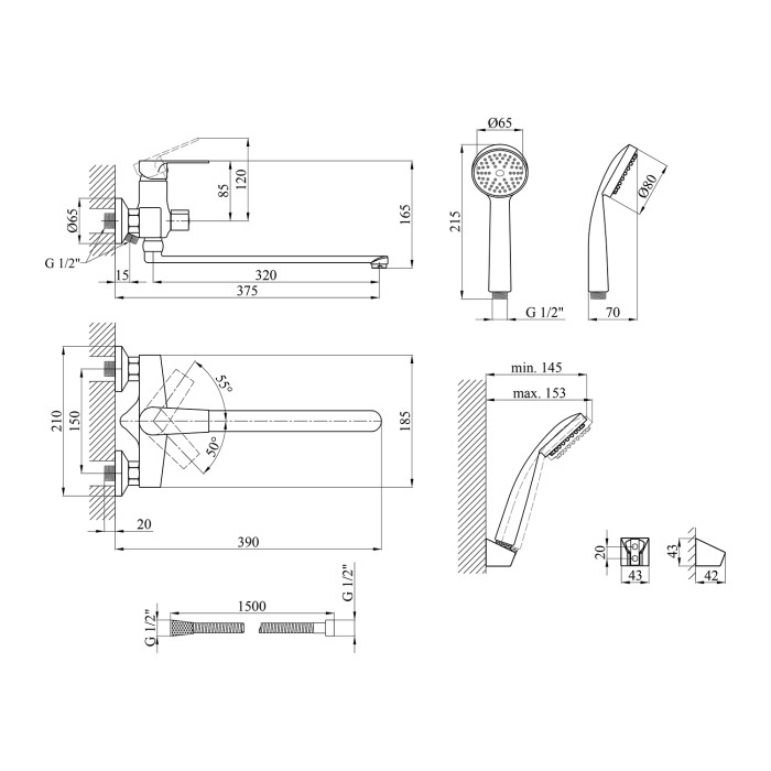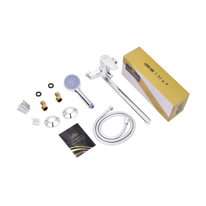 Змішувач, лійка для ручного душу, душовий шланг, кронштейн для ручного душу, кріплення, інструкція.