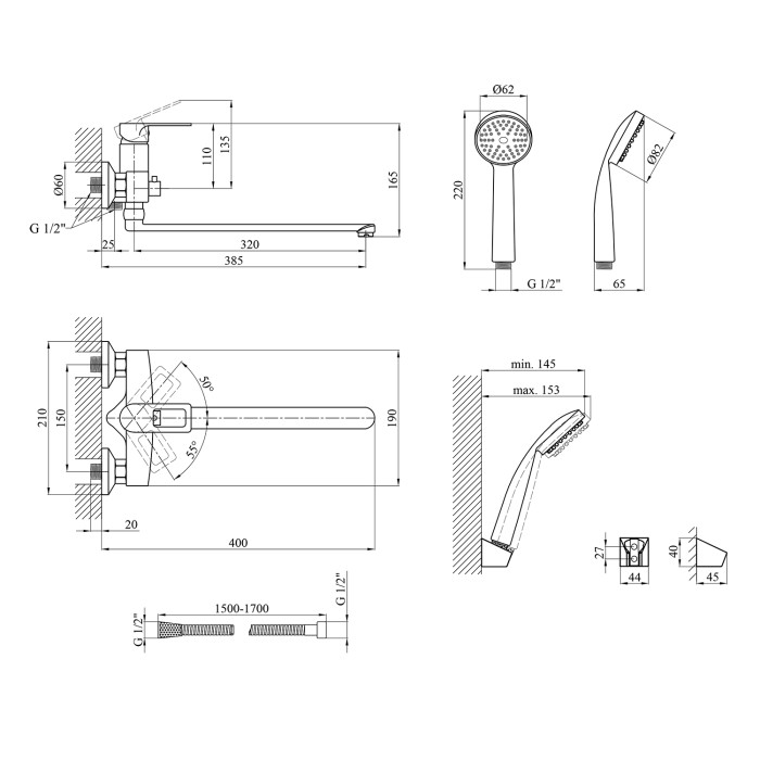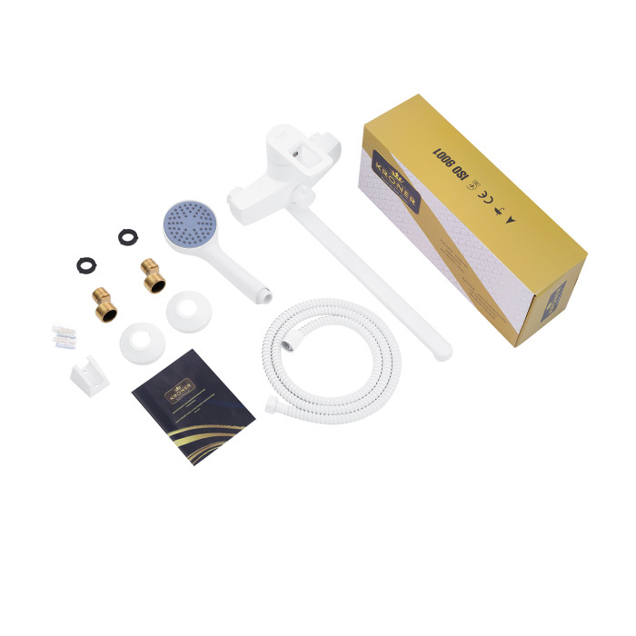 Змішувач, лійка для ручного душу, душовий шланг, кронштейн для ручного душу, кріплення, інструкція.