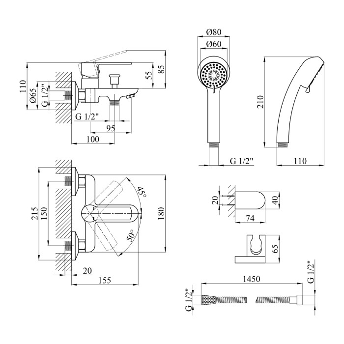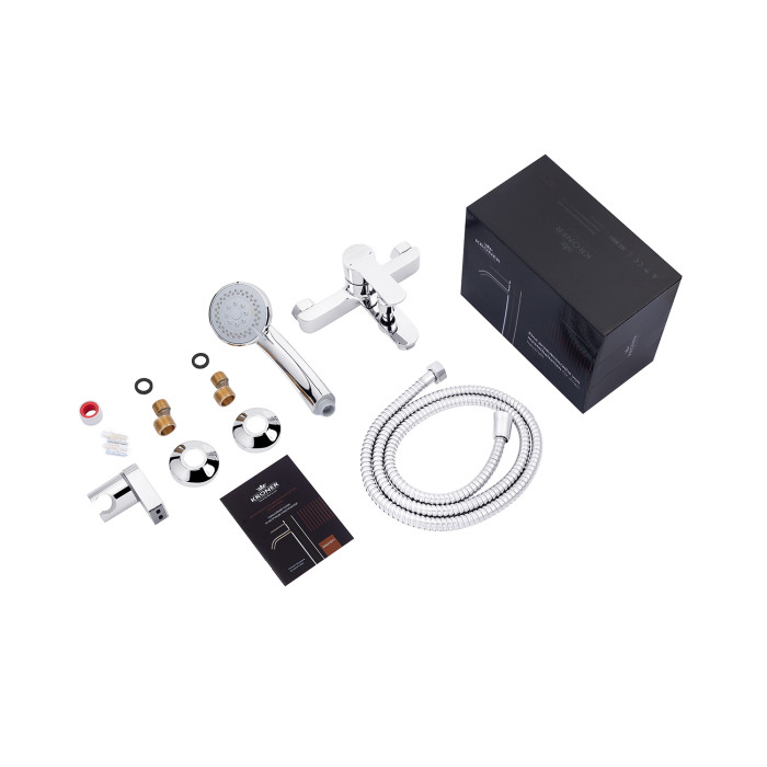 Змішувач, лійка для ручного душу, душовий шланг, кронштейн для ручного душу, кріплення, інструкція.