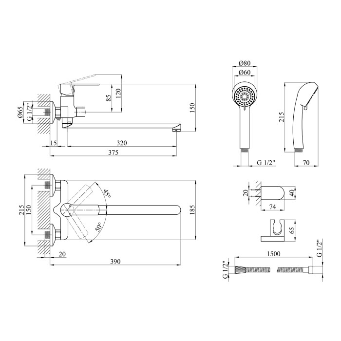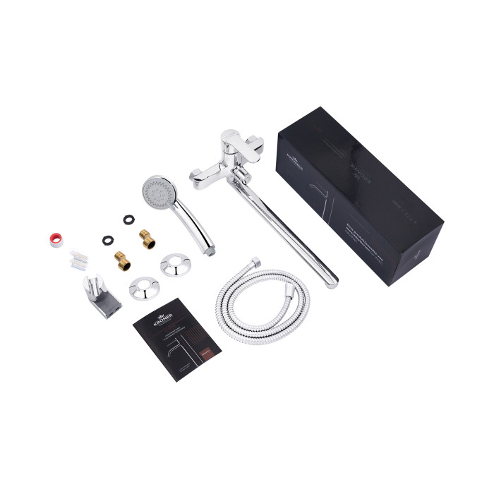 Змішувач, лійка для ручного душу, душовий шланг, кронштейн для ручного душу, кріплення, інструкція.