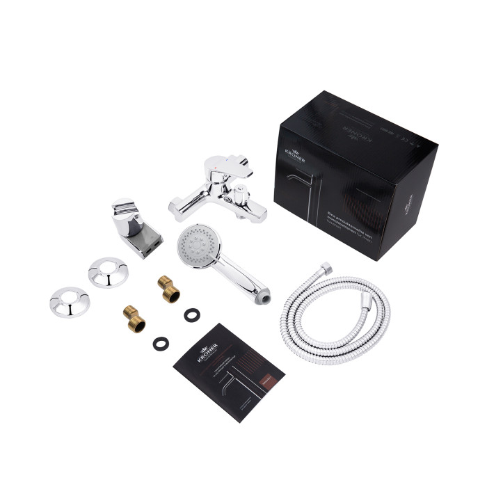 Змішувач, лійка для ручного душу, душовий шланг, кронштейн для ручного душу, кріплення, інструкція.