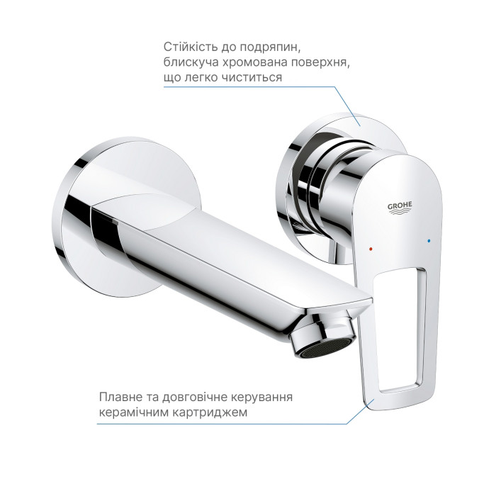 Хромована поверхня змішувача має обробку GROHE Long-Life Shine, яка забезпечує тривалий блиск і стійкість до подряпин. Регульований обмежувач потоку дозволяє економити воду, а розетка з ущільнювальною прокладкою гарантує герметичність та легкість монтажу.