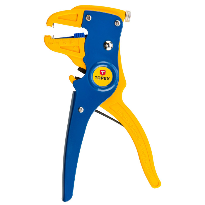 Знімач ізоляції автоматичний TOPEX довжиною 175 мм і робочим діапазоном від 0,5 мм до 6 мм². Має регулювання діапазону та зусилля натиску. Ергономічне руків’я зручно міститься в долоні, що додає комфорту під час праці. Додатково має обрізувач, що уможливлює перерізання кабелів. Марка TOPEX адресована майстрам, які займаються дрібним ремонтом.