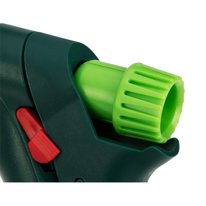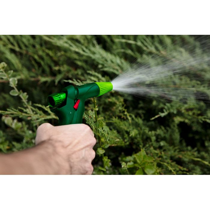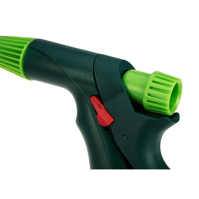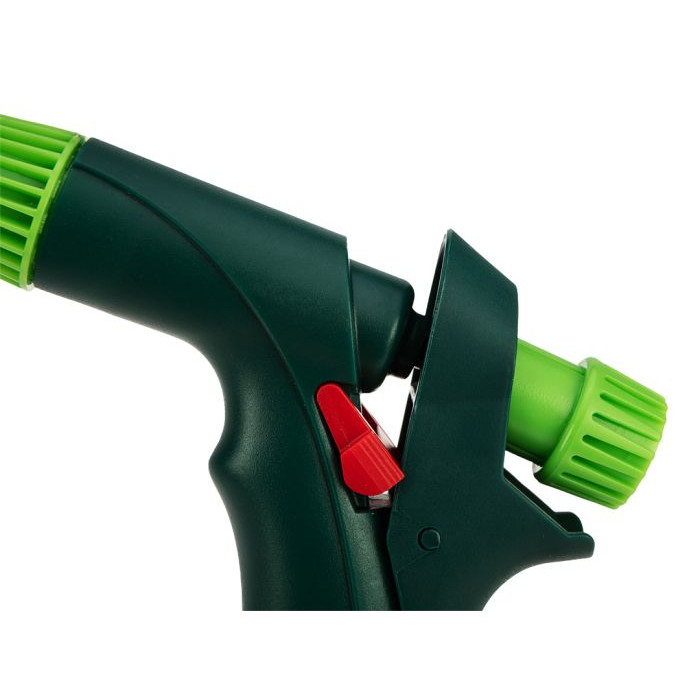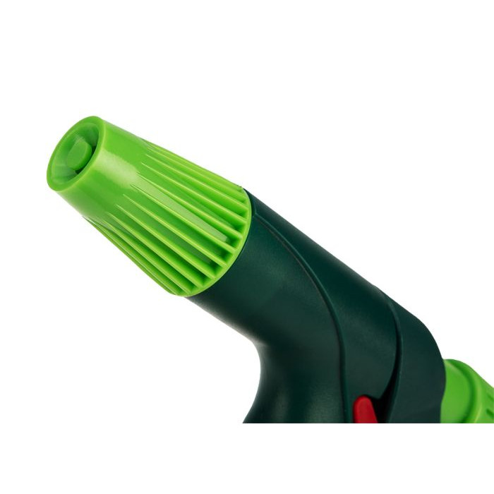 Регульований пістолетний дощувач 15G716 компанії VERTO оснащений ручкою для регулювання форми струменя води – від туману до сильного точкового розпилення. Пістолет також має блокування заднього важеля, що дозволяє працювати у безперервному режимі. Рукоятка ергономічної форми добре лягає в руку і не ковзає, що підвищує зручність роботи. Виготовлений із міцного ABS-пластику.