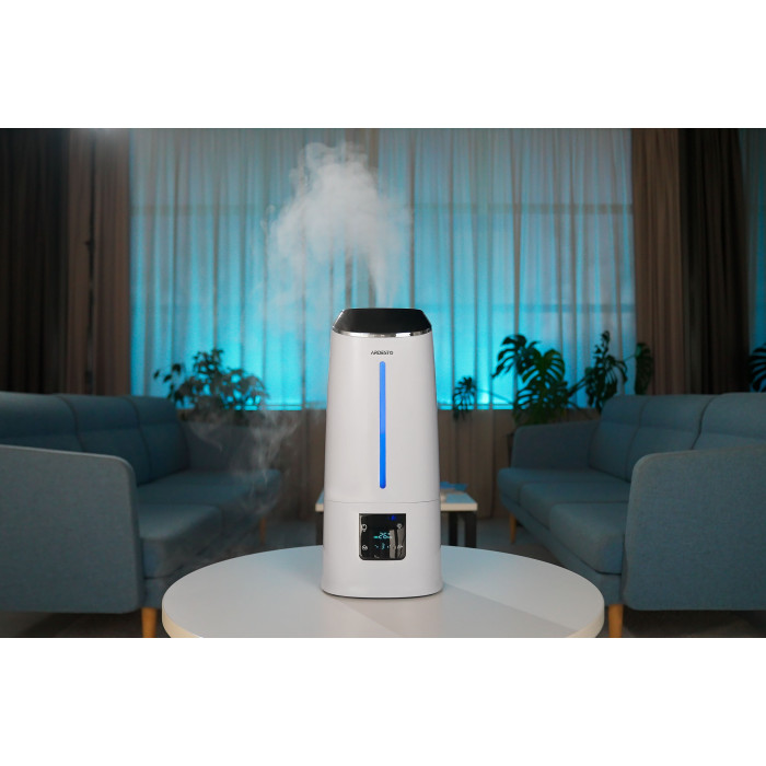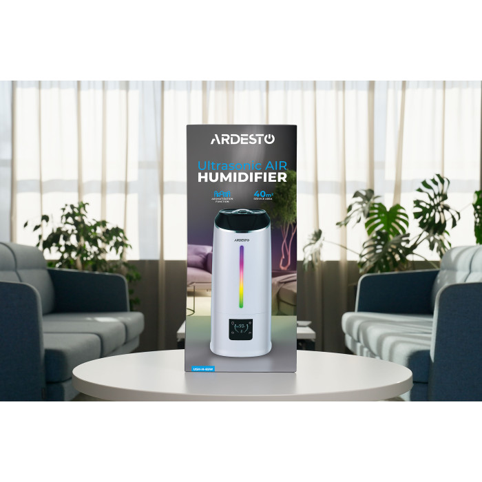 Зволожувач повітря ARDESTO ультразвуковий, 40м2, 6.5л, 390мл/г, електр. кер-ння, пульт ДК, верх. залив води, дисплей, білий