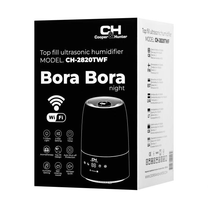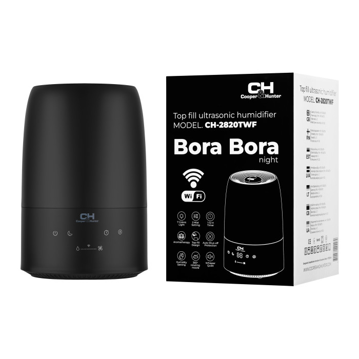 Зволожувач повітря Cooper&Hunter CH-2820TWF 30м2, 2л, 280мл/г, ультразвуковий, верхня затока, WI-FI, гігростат, аромакапсула, підсвічування, чорний